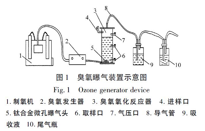 03質(zhì)量濃度38~60mg/L,出氣經(jīng)過置于反應器底部的鈦合金微孔曝氣頭進入臭氧氧化反應器,以20g/L的硼酸為吸收液,啟動臭氧發(fā)生器后淀粉碘化鉀試劑開始變藍時計時,臭氧尾氣由碘化鉀吸收后排放。