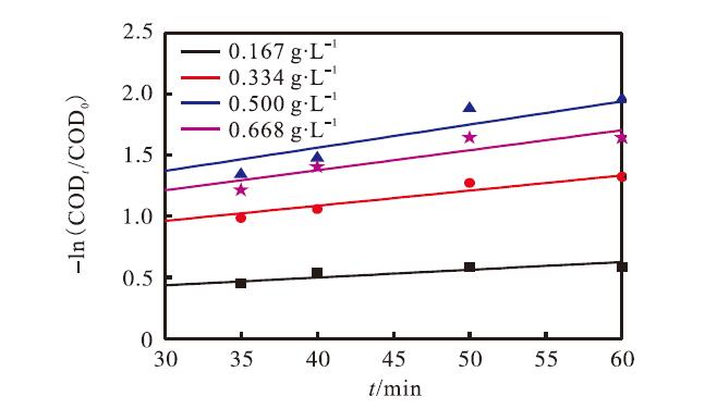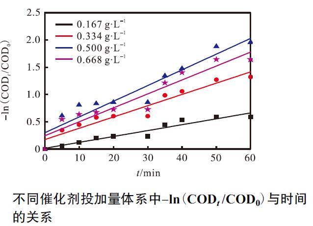 圖3 不同催化劑投加量體系中-ln(CODt /COD0)與時(shí)間的關(guān)系