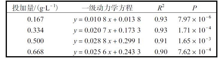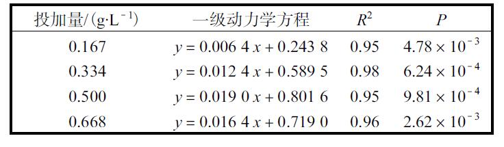 表1 不同催化劑投加量對(duì)模擬草酸廢水降解動(dòng)力學(xué)的影響